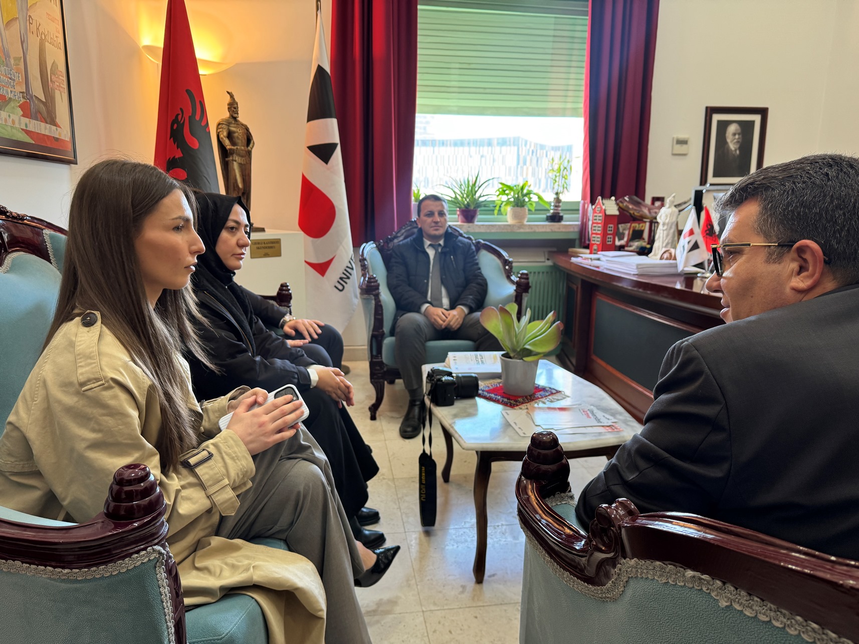 Ditën e mërkurë, më datë 25.02.2026, Rektori i Universitetit të Arteve, Prof. Dr. Erald Bakalli, i shoqëruar nga Zëvendësrektori, Prof. Arian Paço, mirëpriti në zyrën e tij z. Mustafa Ata, Koordinator i TIKA-s në Shqipëri (Tiranë), znj. Nagehan Uslu, Zëvendëskoordinatore e TIKA-s, si dhe z. Oğuzhan Sakoğlu, Drejtor i Institutit Yunus Emre, shoqëruar nga stafi i tyre përkatës.