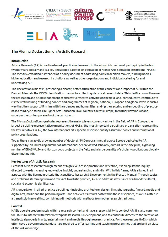 Kërkimi Artistik është kërkim i bazuar në praktikë, i udhëhequr nga praktika në arte, i cili është zhvilluar me shpejtësi njëzet vitet e fundit në nivel global dhe është baza kryesore e njohurive për edukimin e artit në Institucionet Artistike të Arsimit të Lartë. Deklarata e Vjenës është menduar si një dokument politikash, e cila adreson vendimmarrësit politikë, organet financuese, institucionet e arsimit të lartë dhe intitucionet kërkimore, si dhe organizata të tjera apo individë të cilët ndërmarrin Kërkimin Artistik.